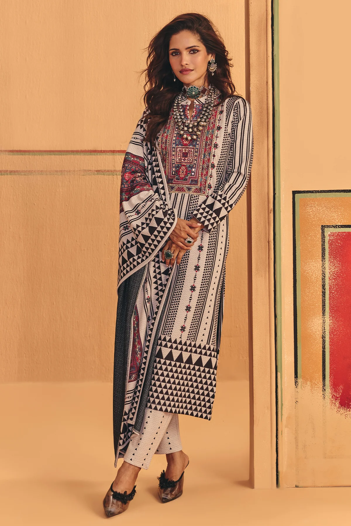 Elevate your winter wardrobe with our off white printed kurta set, adorned with intricate zari embroidered for a refined touch. designed with a mandarin collar, long sleeves, and a sleek straight hemline, this ensemble comes with matching trousers and a dupatta. crafted from plush synthetic velvet, it blends warmth, elegance, and timeless style—perfect for special occasions.